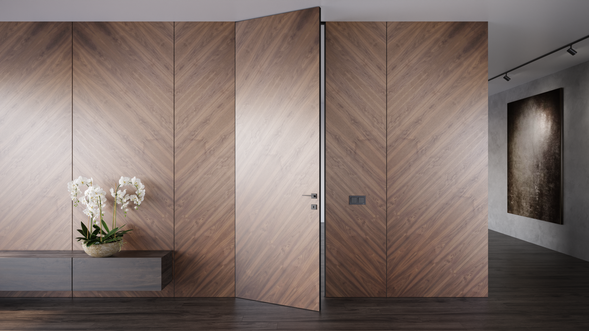 Полотно выполнено в отделке, соответствующей стеновым панелям.